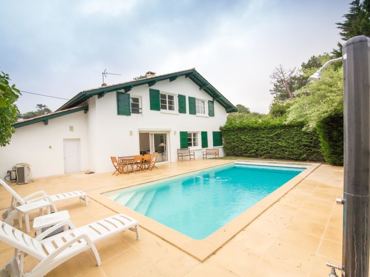 Anglet: Schöne Villa "Thalassa". Im Ortsteil Chiberta, ruhige, sonnige Lage in einem Wohnquartier, 1 km vom Meer, 1 km vom Strand. Zur Alleinbenutzung: Grundstück 500 m2 (eingezäunt), Rasen und Pflanzen, Schwimmbad beheizt (4 x 9 m, 15.05.-15.09.) mit Rollladenabdeckung. Aussendusche, Tischtennis, Basketball, Terrasse, Gartenmöbel, Parkplatz auf dem Grundstück. Lebensmittelgeschäft 1.1 km, Supermarkt 2.5 km, Restaurant 800 m, Bushaltestelle 290 m, Bahnstation "Gare SNCF" 6 km, Sandstrand "Les corsaires" 1 km. Sporthafen 3.9 km, Golfplatz 200 m, Surfschule 1 km, Tennishalle 3.2 km, Reitstall 1 km, Eisfeld 3 km. Nahe gelegene Sehenswürdigkeiten: Biarritz (phare, aquiarium) 3 km, Halles d'Anglet 1.7 km, Bayonne 5.6 km, San Sebastien 50 km. Wandergebiete: La Rhune 39 km. Bitte beachten: Flugplatz 6 km vom Haus.