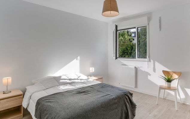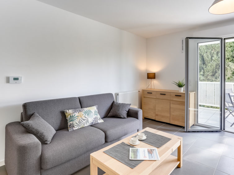 2-Zimmer-Wohnung 48 m2 im 3. Stock, Südostlage. Komfortabel und modern eingerichtet: Wohn-/Esszimmer mit 1 Doppeldiwanbett (140 cm, Länge 190 cm), TV (Flachbildschirm). Ausgang zur Terrasse. 1 Zimmer mit 1 franz. Bett (140 cm, Länge 190 cm). Offene Küche (Geschirrspüler, 3 Glaskeramikherd Platten, elektrische Kaffeemaschine, Kapseln für die Kaffeemaschine (Senseo) extra, Kombinationsmikrowelle). Dusche/WC. G-Heizung. Balkon 9 m2, Südostlage. Balkonmöbel. Zur Verfügung: Waschmaschine, Bügeleisen, Haartrockner. Internet (Wireless LAN, extra). Parkplatz Nr. 33. Bitte beachten: Nichtraucher-Unterkunft. Rauchmelder. 641020002068C
