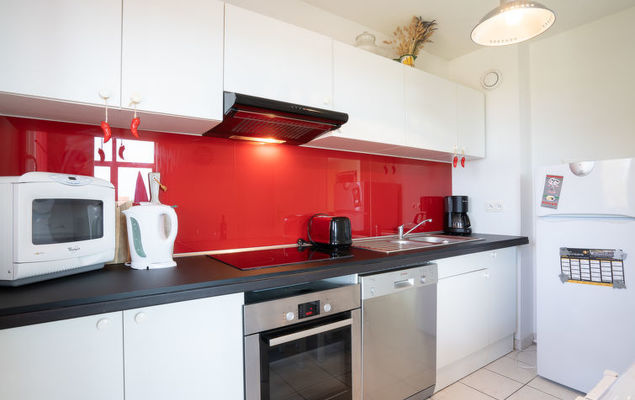 3-Zimmer-Wohnung 63 m2 im 1. Stock. Komfortabel und schön eingerichtet: Wohn-/Esszimmer mit TV (Flachbildschirm). Ausgang zur Terrasse. 1 Zimmer mit 1 franz. Bett (1 x 140 cm, Länge 190 cm). 1 Zimmer mit 1 franz. Bett (1 x 160 cm, Länge 200 cm). Küche (Backofen, Geschirrspüler, 4 Glaskeramikherd Platten, Mikrowelle, Tiefkühler, elektrische Kaffeemaschine). Ausgang zur Terrasse. Dusche, sep. WC, Doppelwaschbecken. Terrasse 11 m2, Westlage. Terrassenmöbel. Schöne Sicht auf das Meer. Zur Verfügung: Waschmaschine, Bügeleisen, Haartrockner. Internet (Wireless LAN, extra). Parkplatz Nr. 10 et 11 (2 Autos). Bitte beachten: Rauchmelder. 64125000541B3