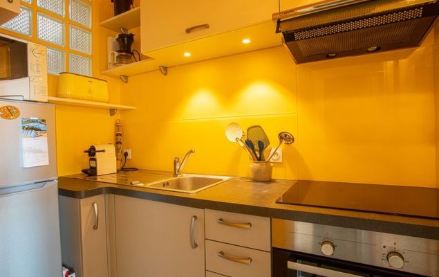 2-Zimmer-Wohnung 42 m2 im 1. Stock. Hell, schön eingerichtet: Wohn-/Esszimmer mit TV (Flachbildschirm). 1 grosses Zimmer mit 1 franz. Bett (1 x 140 cm, Länge 190 cm). Kleine Küche (Backofen, 3 Induktionskochplatten, Toaster, Mikrowelle, elektrische Kaffeemaschine, Kapseln für die Kaffeemaschine (Nespresso) extra). Dusche, sep. WC. E-Heizung. Zur Verfügung: Waschmaschine. Internet (Wireless LAN, extra). Bitte beachten: Nichtraucher-Unterkunft. Rauchmelder.