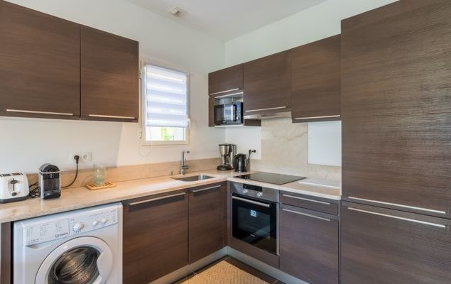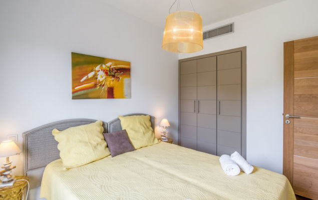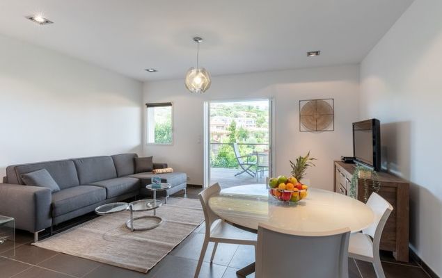 3-Zimmer-Wohnung 77 m2 im 1. Stock. Sehr zweckmässig und schön eingerichtet: Wohn-/Esszimmer mit 1 Doppeldiwanbett (140 cm, Länge 200 cm), TV (Flachbildschirm). Ausgang zur Terrasse. 1 Zimmer mit 1 franz. Bett (160 cm, Länge 200 cm), Dusche/WC. Ausgang zur Terrasse. 1 Zimmer mit 2 Betten (90 cm, Länge 190 cm). Ausgang zum Balkon. Offene Küche (Backofen, Geschirrspüler, 3 Induktionskochplatten, Toaster, Wasserkocher, Mikrowelle, Tiefkühler, elektrische Kaffeemaschine, Kapseln für die Kaffeemaschine (Nespresso et filtre) extra). Dusche, sep. WC. Klimaanlage. Grosse Terrasse 50 m2. Terrassenmöbel, Liegestühle (2). Eingeschränkte Sicht auf das Meer. Zur Verfügung: Waschmaschine. Internet (Wireless LAN, gratis). Parkplatz. Bitte beachten: geeignet für Familien. 1 Haustier/Hund erlaubt. Rauchmelder, kein Fahrstuhl.