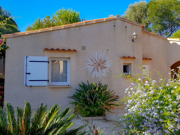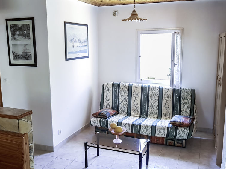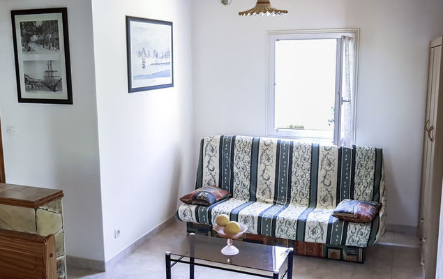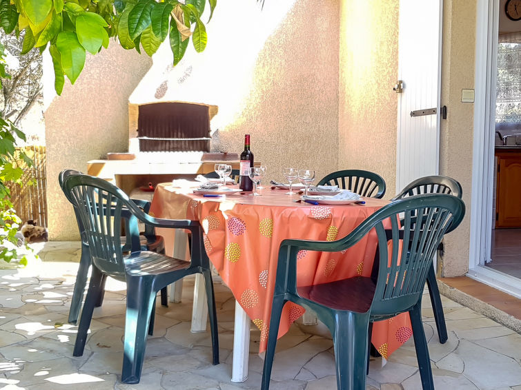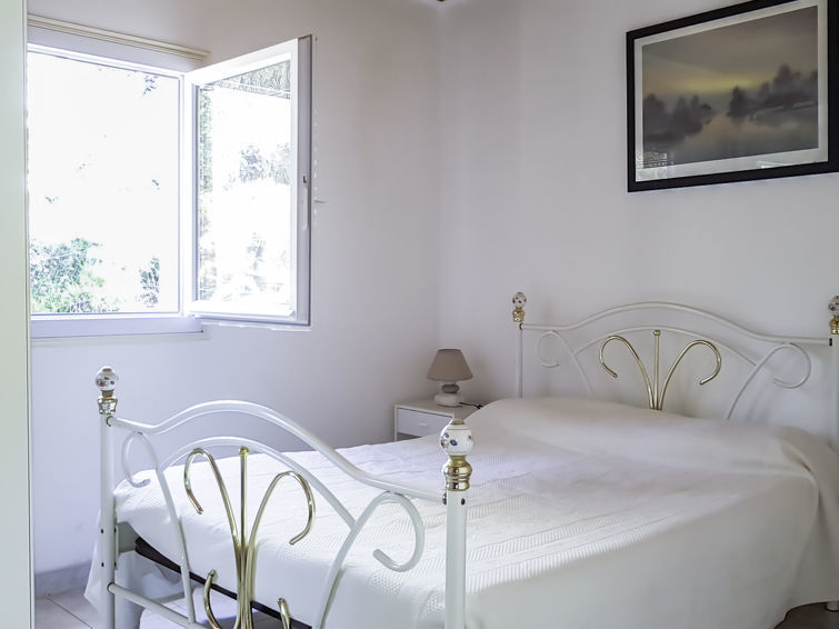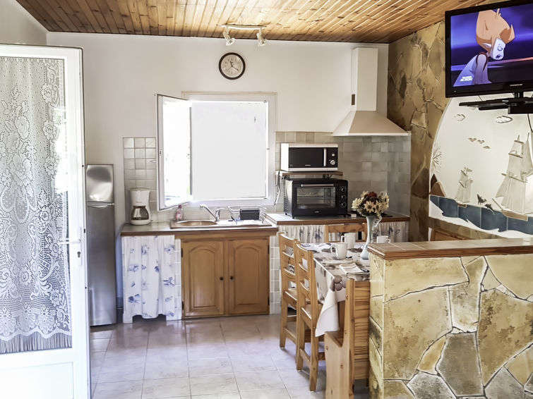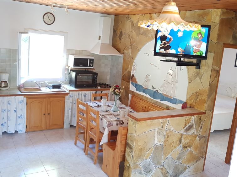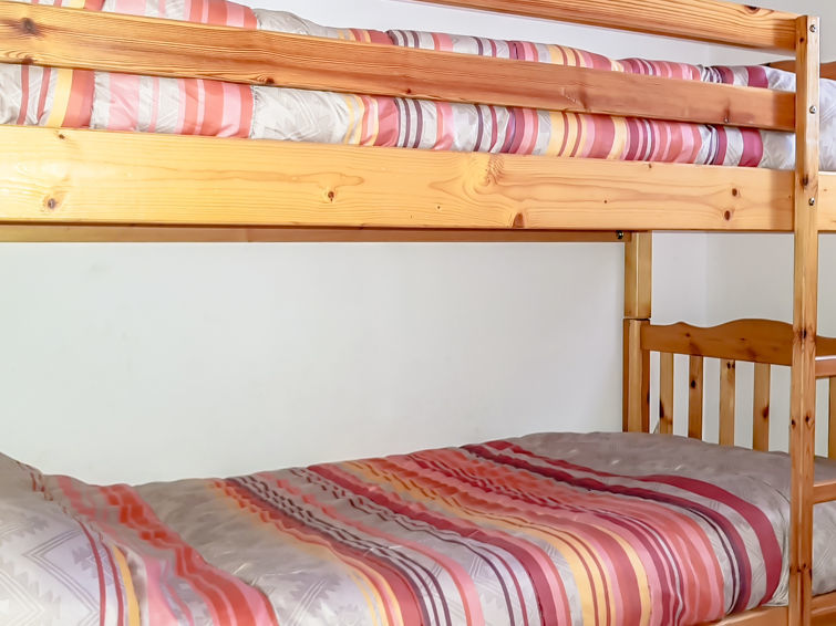 3-Zimmer-Haus 45 m2. Wohn-/Esszimmer mit 1 Doppeldiwanbett und TV. 1 Zimmer mit 1 franz. Bett. 1 kleines Zimmer mit 1 x 2 Etagenbetten. Kochnische (2 Kochplatten, Mini-Backofen, Mikrowelle). Dusche/WC. E-Heizung. Terrasse 25 m2. Terrassenmöbel, Gartengrill. Sicht auf das Schwimmbad. Doppelverglasung.