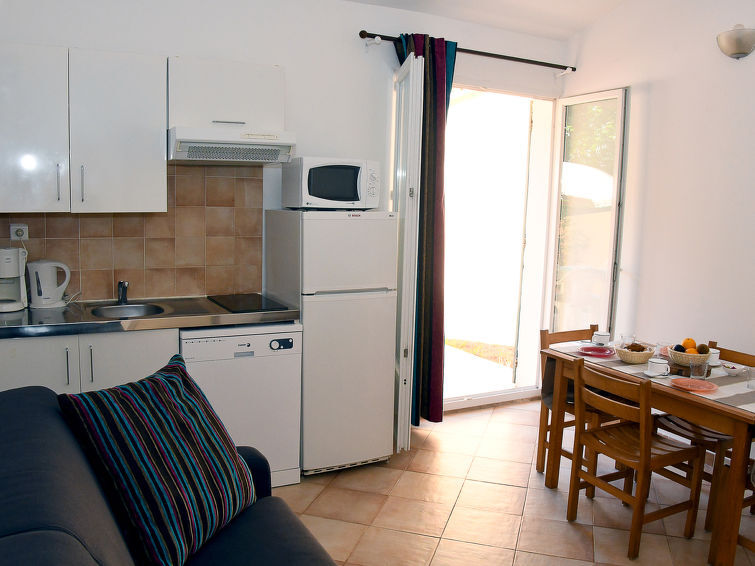 "T2 Cabine Type C", 2-Zimmer-Reihenhaus 32 bis 35 m2. Objekt geeignet für 4 Erwachsene + 2 Kinder. Zweckmässig eingerichtet: Wohn-/Esszimmer mit 1 Doppeldiwanbett (140 cm, Länge 190 cm), 1 x 2 Etagenbetten (90 cm, Länge 190 cm), TV (Flachbildschirm), Klimaanlage. Ausgang zur Terrasse. 1 Zimmer mit 1 Doppelbett (140 cm, Länge 190 cm). Kochnische (Geschirrspüler, 2 Glaskeramikplatten, Wasserkocher, Mikrowelle, elektrische Kaffeemaschine). Bad/WC. E-Heizung. Balkon oder Terrasse. Terrassenmöbel. Sicht auf den Garten. Zur Verfügung: Internet (WLAN). Bitte beachten: Maximal 2 Haustiere/Hunde erlaubt. Rauchmelder.