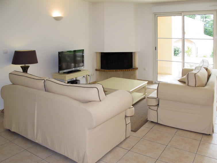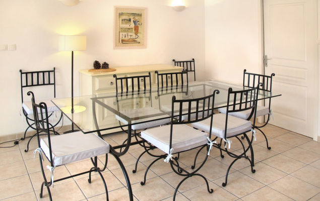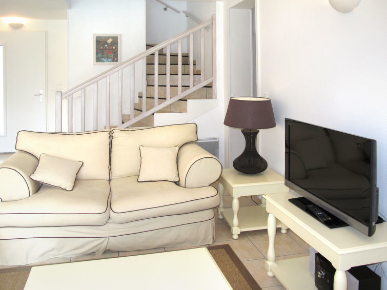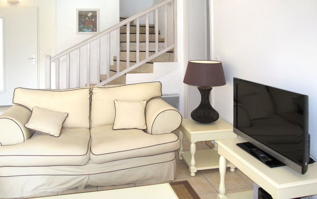 "Domaine Royal Green (MZA100)", 4-Zimmer-Haus 114 m2 auf 2 Stockwerken. Schön und geschmackvoll eingerichtet: Wohn-/Schlafzimmer mit 1 Doppeldiwanbett und offenem Kamin (nur Deko), Esstisch und Sat-TV. Ausgang zur Terrasse. 1 Zimmer mit 2 Betten. Ausgang zur Terrasse. 1 Zimmer mit 2 Betten. Offene Küche (Backofen, Geschirrspüler, 4 Glaskeramikherd Platten, Toaster, Wasserkocher, Mikrowelle, Tiefkühler, elektrische Kaffeemaschine). Dusche, 2 sep. WC's, Doppelwaschbecken. Obergeschoss: 1 grosses Zimmer mit begehbarer Kleiderschrank mit 1 franz. Bett (160 cm). Ausgang zum Balkon. Bad/Dusche, sep. WC, Doppelwaschbecken. E-Heizung. Balkon, Terrasse teilweise überdacht. Terrassenmöbel, Gartengrill (mobil), Liegestühle (3). Zur Verfügung: Waschmaschine, Wäschetrockner, Bügeleisen, Kinderhochstuhl, Babybett (extra). Bitte beachten: Nichtraucher-Haus. Maximal 2 Haustiere/Hunde erlaubt. Rauchmelder, Feuerlöscher.