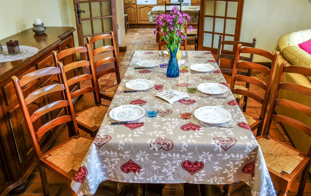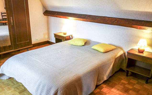 4-Zimmer-Haus 122 m2 auf 2 Stockwerken. Schön und rustikal eingerichtet: Wohn-/Esszimmer mit offenem Kamin und Sat-TV (Flachbildschirm). Ausgang zum Garten. Küche (Backofen, Geschirrspüler, 3 Flammen, Toaster, Wasserkocher, Mikrowelle, Tiefkühler, elektrische Kaffeemaschine) mit Esstisch. Bad, sep. WC. Obergeschoss: 2 Zimmer, jedes Zimmer mit 1 franz. Bett (140 cm, Länge 190 cm). 1 abgeschrägtes Zimmer mit 3 Betten (90 cm, Länge 190 cm). Sep. WC. E-Heizung. Terrasse 12 m2. Terrassenmöbel, Gartengrill (mobil), Liegestühle (6). Zur Verfügung: Waschmaschine, Bügeleisen, Kinderhochstuhl, Babybett bis 2 Jahre, Holz (gratis). Bitte beachten: geeignet für Familien. Nichtraucher-Haus. Rauchmelder.