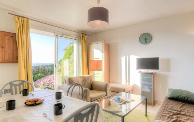 3-Zimmer-Wohnung 37 m2, im Erdgeschoss. Wohn-/Esszimmer mit TV (Flachbildschirm). Ausgang zum Garten, zur Terrasse. 1 Zimmer mit 1 franz. Bett (140 cm). 1 kleines Zimmer mit 1 Doppeldiwanbett (1 x 140 cm, Länge 190 cm). Küche (2 Kochplatten, Mini-Backofen, Geschirrspüler, Toaster, Wasserkocher, elektrische Kaffeemaschine). Bad, sep. WC. Terrasse, Westlage, Garten 75 m2, Westlage. Terrassenmöbel. Schöne Panoramasicht auf das Meer und die Landschaft. Zur Verfügung: Internet (Wireless LAN, gratis). Parkplatz (2 Autos). Bitte beachten: Nichtraucher-Unterkunft. Maximal 1 Haustier/Hund erlaubt. Rauchmelder.