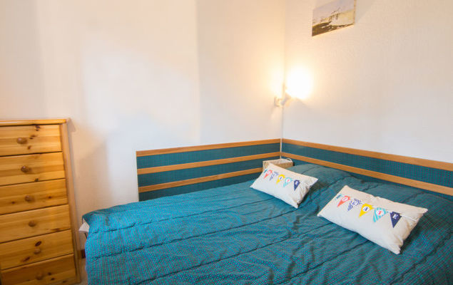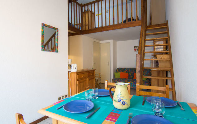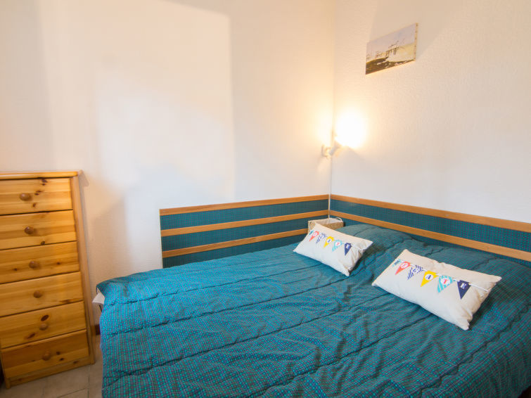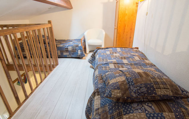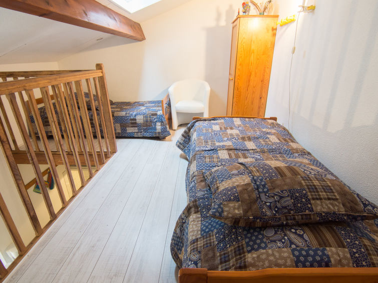 2-Zimmer-Reihenhaus 25 m2 auf 2 Stockwerken. Wohn-/Esszimmer mit TV. Ausgang zur Terrasse. 1 Zimmer mit 1 franz. Bett (1 x 140 cm, Länge 190 cm). Kochnische (3 Kochplatten, Mini-Backofen). Bad/WC. Obergeschoss: abgeschrägte Galerie, Deckenhöhe 110 - 240 cm mit 2 Betten (90 cm, Länge 190 cm). Terrasse 8 m2, Ostlage. Terrassenmöbel. Zur Verfügung: Internet (Wireless LAN, extra). Bitte beachten: Maximal 1 Haustier/Hund erlaubt. Rauchmelder.