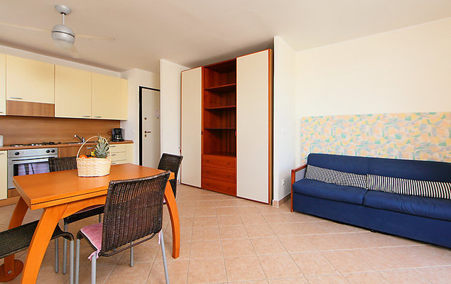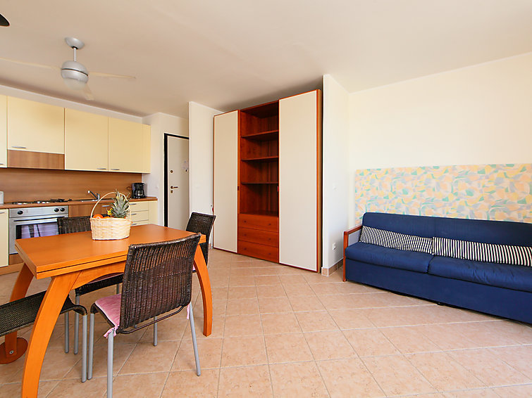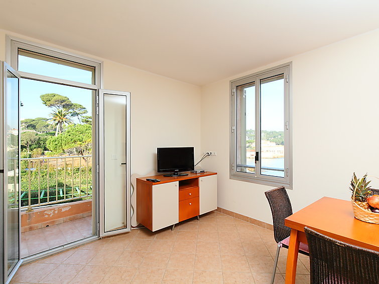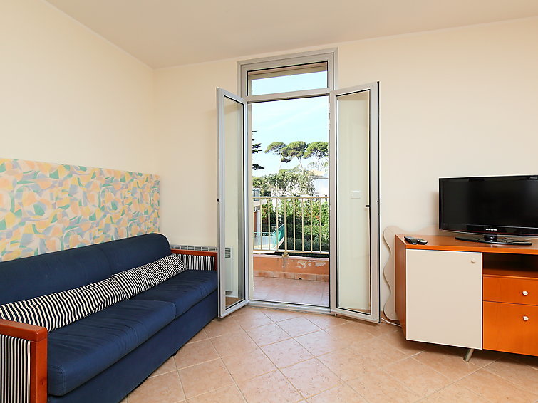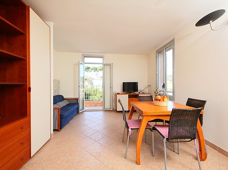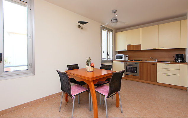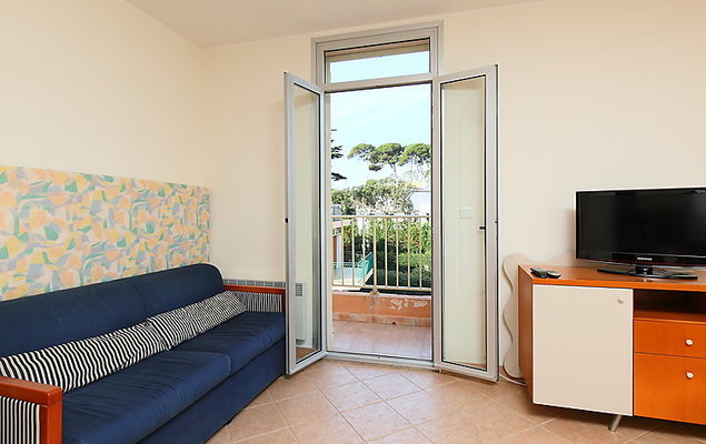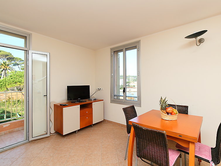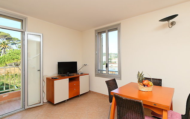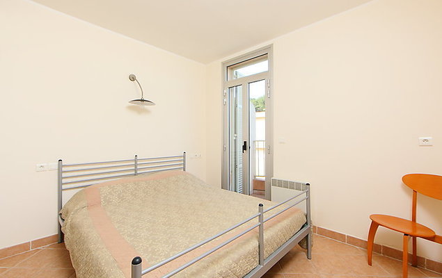 2-Zimmer-Wohnung 45 m2 im 2. Stock. Einfach eingerichtet: Wohn-/Esszimmer mit 1 Diwanbett (120 cm, Länge 190 cm). Ausgang zum Balkon. 1 Zimmer mit 1 franz. Bett (160 cm, Länge 200 cm). Offene Küche (4 Kochplatten, Backofen, Mikrowelle). Dusche/WC. E-Heizung. Balkon 5 m2. Seitliche Sicht auf das Meer. Zur Verfügung: Internet (Wireless LAN, extra). Bitte beachten: Maximal 1 Haustier/Hund erlaubt. TV nur FR. Rauchmelder. 06004192980CM