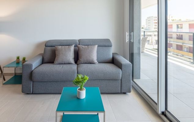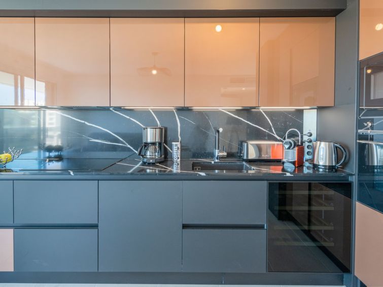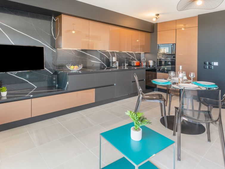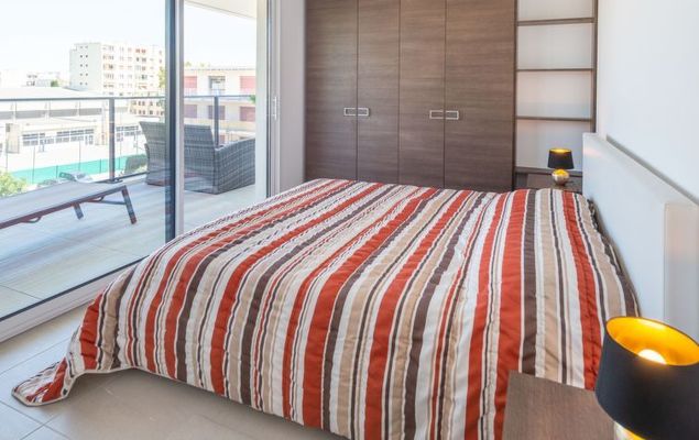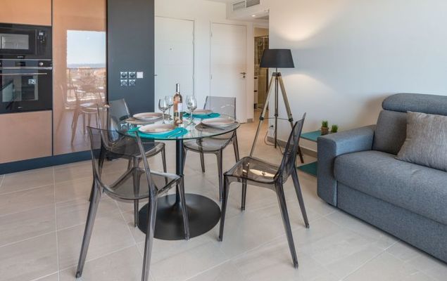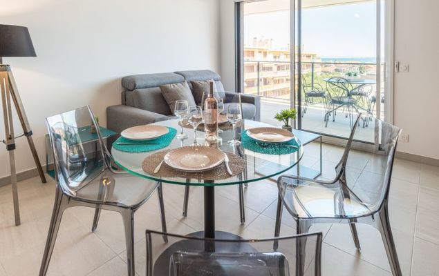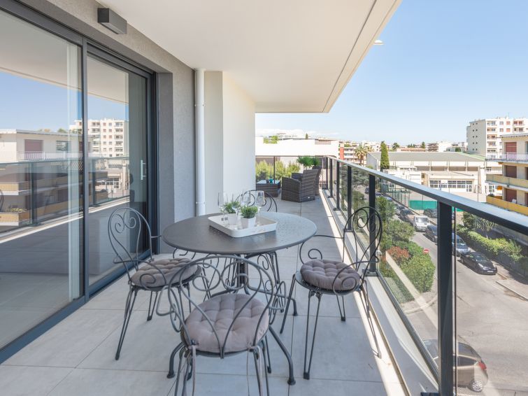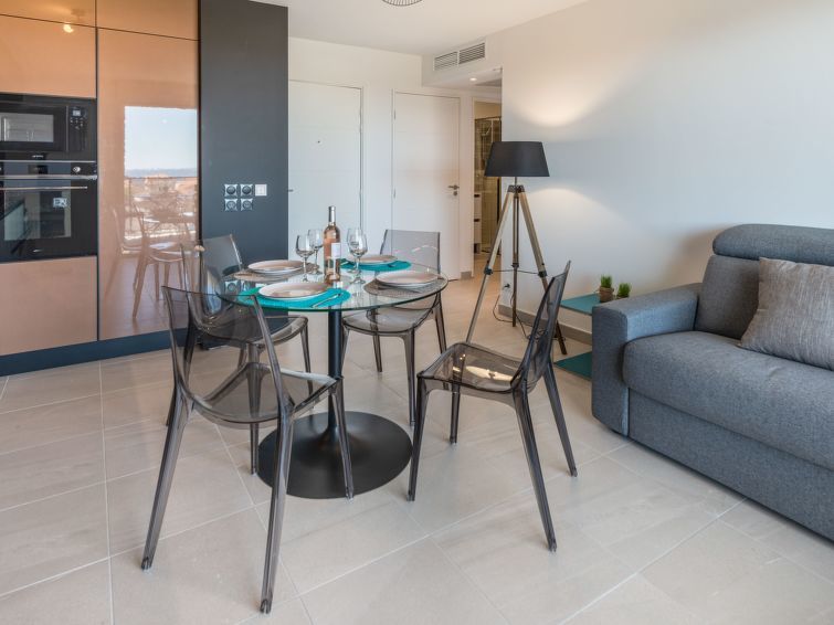 "Le Grey Pearl", 2-Zimmer-Wohnung 40 m2 im 3. Stock. Hell, schön und modern eingerichtet: Wohn-/Esszimmer mit Panoramafenster mit 1 Doppeldiwanbett (140 cm, Länge 190 cm), TV (Flachbildschirm). Ausgang zur Terrasse. 1 grosses Zimmer 12 m2 mit 1 franz. Bett (160 cm, Länge 190 cm). Ausgang zur Terrasse. Offene Küche (Backofen, Geschirrspüler, 4 Induktionskochplatten, Toaster, Wasserkocher, Mikrowelle, Tiefkühler, elektrische Kaffeemaschine, Kapseln für die Kaffeemaschine (Nespresso) extra). Ausgang zur Terrasse. Dusche/WC. Klimaanlage. Grosse Terrasse 28 m2, Ostlage und Südlage. Terrassenmöbel, Liegestühle. Schöne Sicht auf das Meer. Zur Verfügung: Waschmaschine, Bügeleisen, Haartrockner. Internet (Wireless LAN, gratis). Garage Nr. 207 NIVEAU -2 (2 Autos). Bitte beachten: Rauchmelder. 06027017706AK