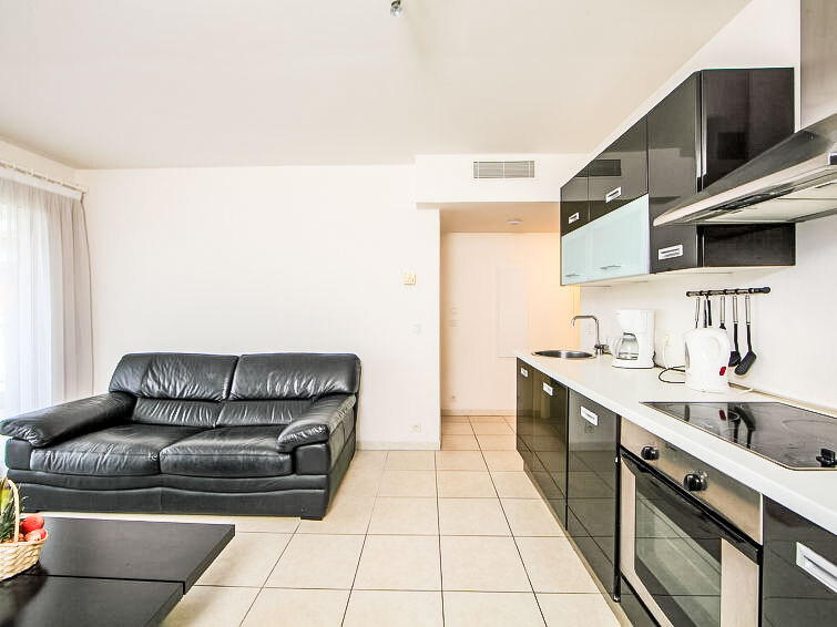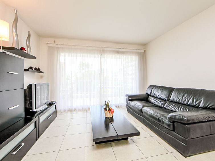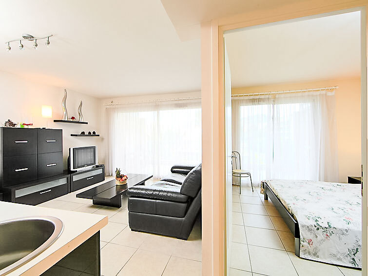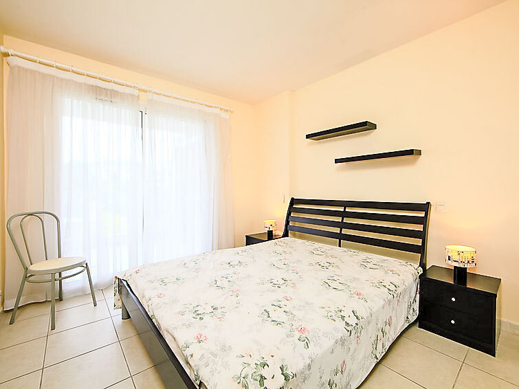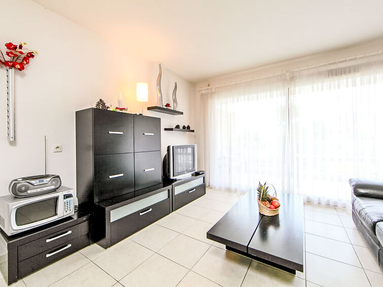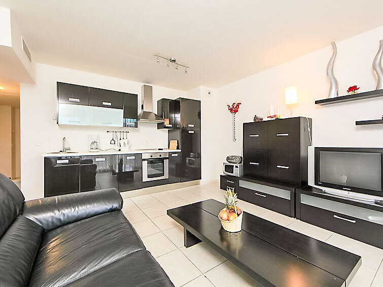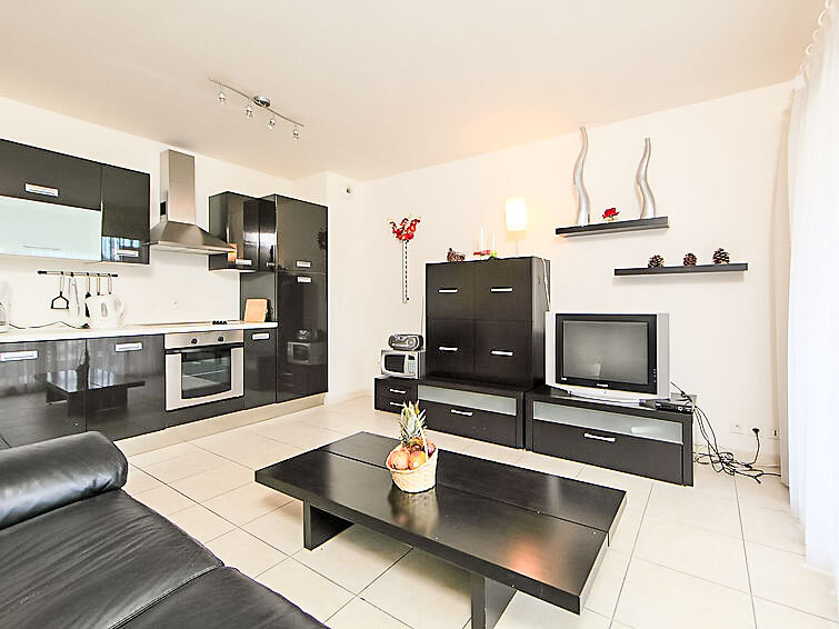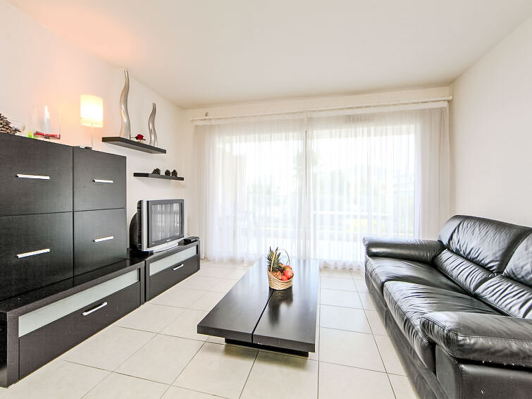 2-Zimmer-Wohnung 45 m2 im 2. Stock. Schön und modern eingerichtet: Wohn-/Esszimmer mit 1 Doppeldiwanbett (140 cm, Länge 190 cm), TV, Radio, CD, DVD und Klimaanlage. Ausgang zur Terrasse. 1 Zimmer mit 1 franz. Bett (160 cm, Länge 200 cm), Klimaanlage. Ausgang zur Terrasse. Offene Küche (4 Kochplatten, Backofen, Geschirrspüler, Mikrowelle). Dusche/Bidet/WC. E-Heizung. Terrasse 16 m2, überdacht, Nordwestlage. Terrassenmöbel. Zur Verfügung: Waschmaschine. Internet (WLAN, extra). Garage Nr. 28, Höhe 220 cm, Breite 220 cm. Bitte beachten: TV nur FR. Rauchmelder. Bitte beachten: im Wohnzimmer ist kein Esstisch vorhanden. 06029003758SB