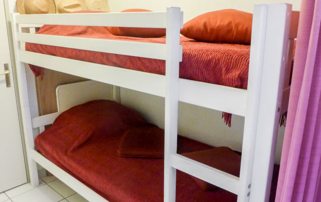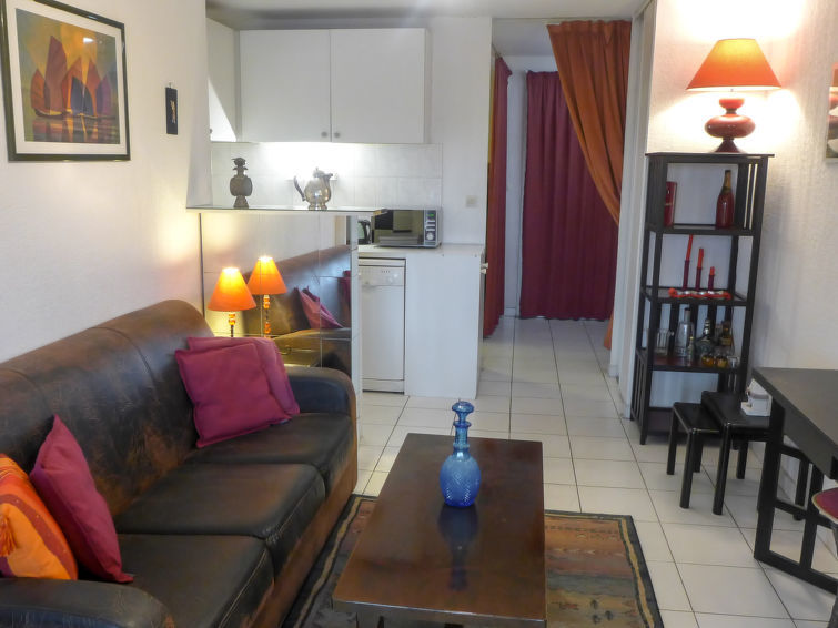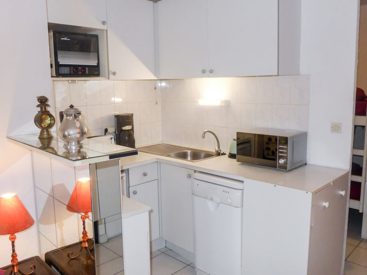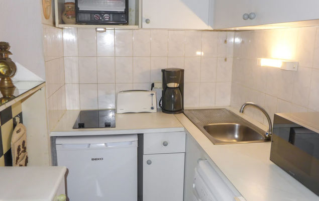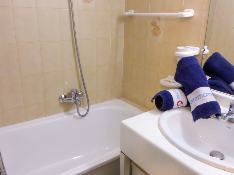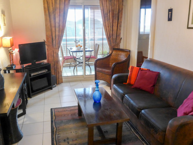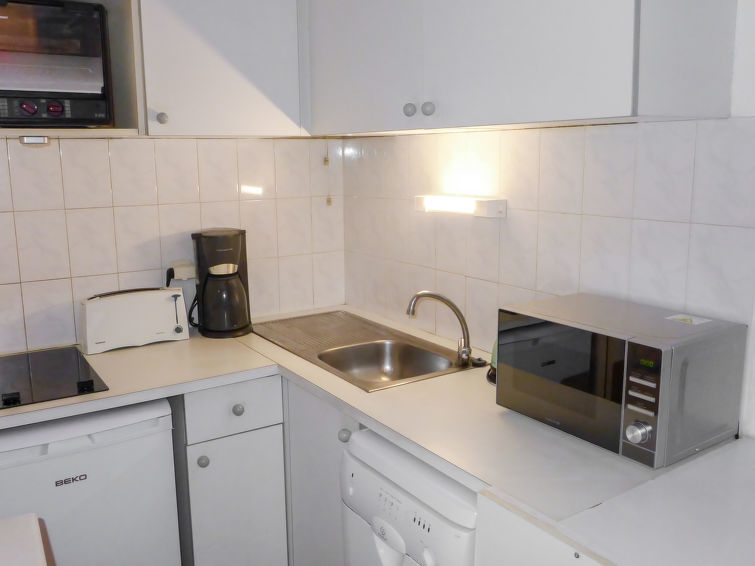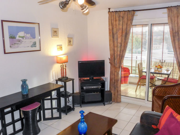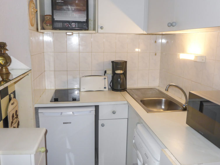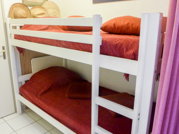2-Zimmer-Wohnung 35 m2 im 2. Stock. Zweckmässig und schön eingerichtet: Wohnzimmer mit TV, Flachbildschirm, Stereoanlage, DVD und Ventilator. Ausgang zur Terrasse. 1 Zimmer mit Schiebetür mit 1 franz. Bett (1 x 140 cm, Länge 190 cm), Ventilator. Kabine mit 1 x 2 Etagenbetten (90 cm, Länge 190 cm). Offene Küche (Backofen, Geschirrspüler, 2 Glaskeramikherd Platten, Toaster, Wasserkocher, Mikrowelle, elektrische Kaffeemaschine). Bad, sep. WC. Terrasse 8 m2, Ostlage. Terrassenmöbel, Elektrogrill. Zur Verfügung: Waschmaschine. Internet (Wireless LAN, extra). Parkplatz Nr. 27 (eingezäunt). Bitte beachten: TV nur FR. Rauchmelder. überdachte und geschlossene Terrasse. Blick von der Terrasse ohne Gegenüber.