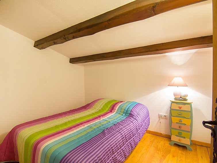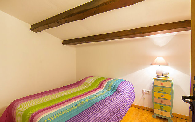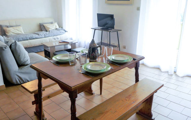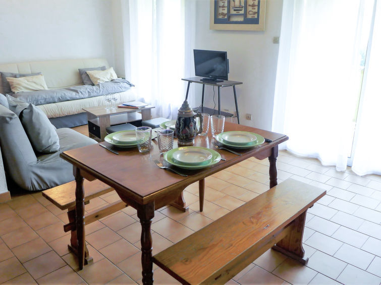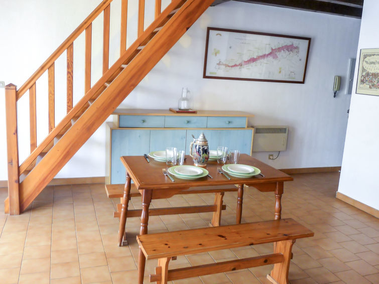 3-Zimmer-Wohnung 48 m2 auf 2 Stockwerken im 1. Stock, Südlage. Zweckmässig und komfortabel eingerichtet: Eingang. Wohn-/Esszimmer mit Schiebetür mit TV (Flachbildschirm), E-Heizung und Klimaanlage. Ausgang zur Terrasse. Küche (Geschirrspüler, 3 Induktionskochplatten, Toaster, Wasserkocher, elektrische Kaffeemaschine, Kombinationsmikrowelle, Fondue Set (Käse)). Obergeschoss: Durchgangszimmer abgeschrägtes, offenes mit 1 franz. Bett (140 cm, Länge 190 cm). 1 Zimmer mit 2 Betten (90 cm, Länge 190 cm), Ventilator. 1 Zimmer mit 1 franz. Bett (140 cm, Länge 190 cm). Dusche, sep. WC. Terrasse, Südlage. Terrassenmöbel. Zur Verfügung: Waschmaschine, Bügeleisen. Internet (Wireless LAN, extra). Parkplatz Nr. 7. Bitte beachten: Rauchmelder.
