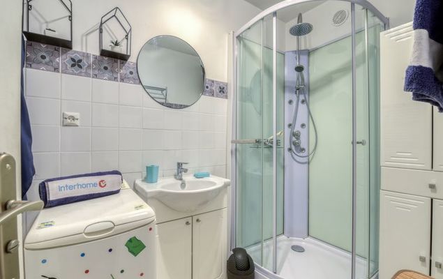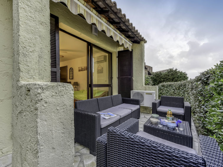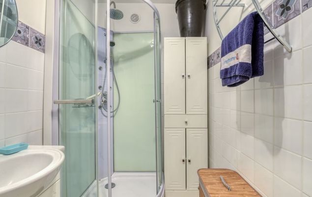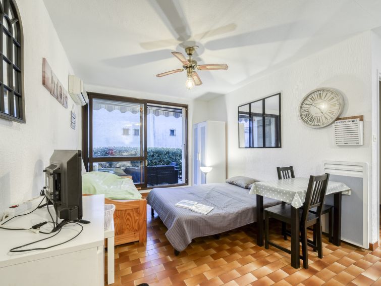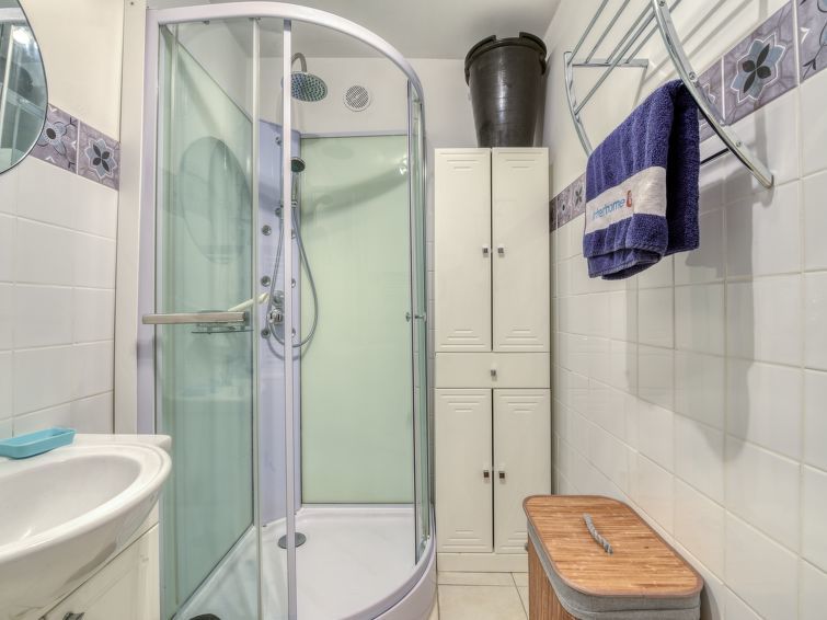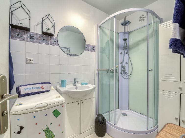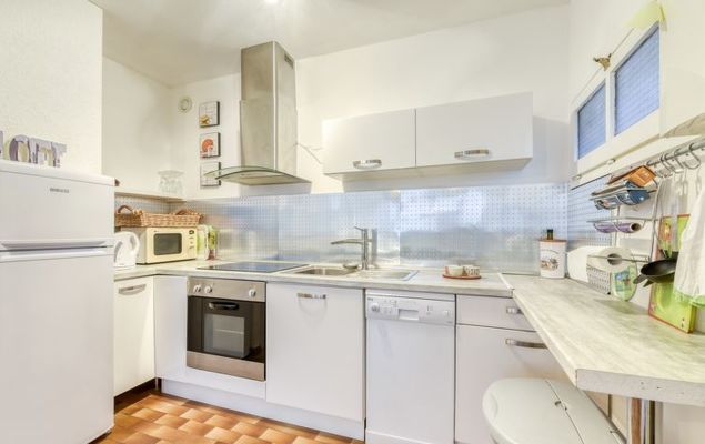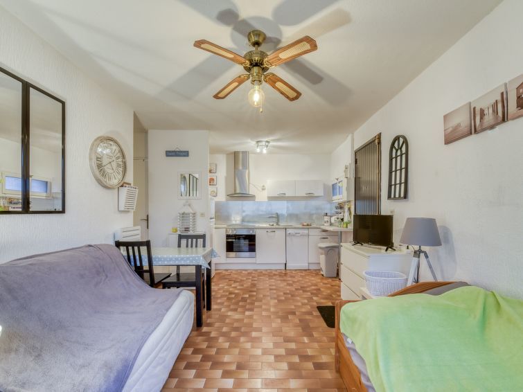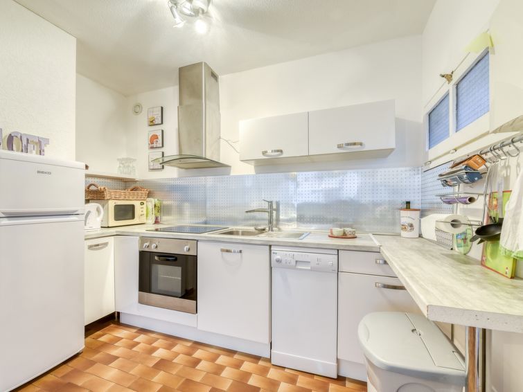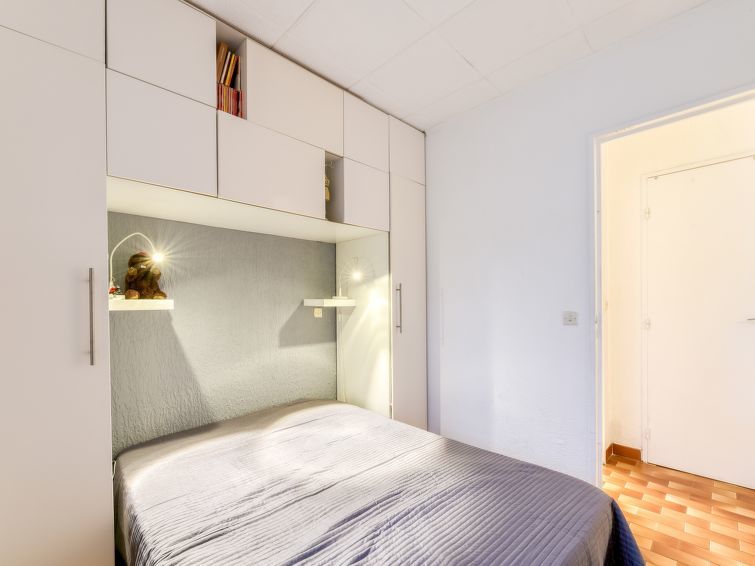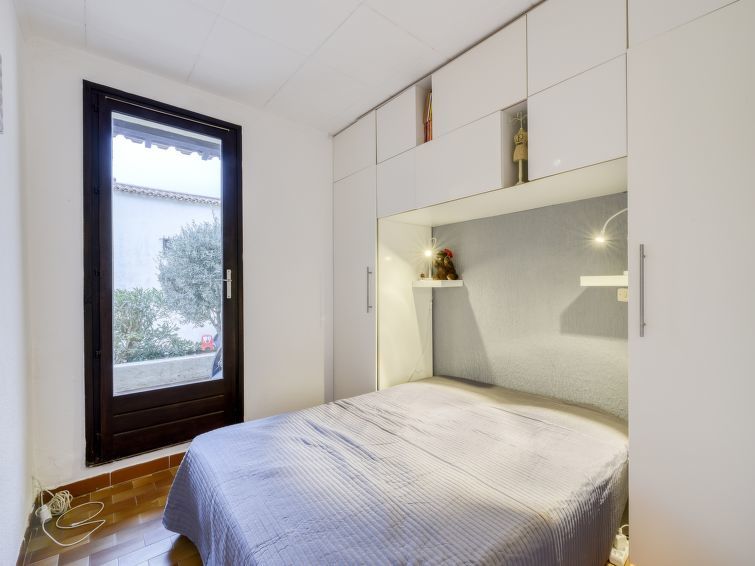 2-Zimmer-Wohnung 31 m2 im 1. Stock. Komfortabel und schön eingerichtet: Wohn-/Esszimmer mit 1 Doppeldiwanbett (140 cm, Länge 190 cm), TV (Flachbildschirm), Klimaanlage. Ausgang zur Terrasse. 1 Zimmer mit 1 franz. Bett (140 cm, Länge 190 cm), Ventilator. Ausgang zur Terrasse. Offene Küche (Backofen, Geschirrspüler, 4 Induktionskochplatten, Toaster, Wasserkocher, Mikrowelle, elektrische Kaffeemaschine). Dusche, sep. WC. E-Heizung. Grosse Terrasse 30 m2, Südwestlage. Terrassenmöbel, Elektrogrill, Liegestühle (2). Eingeschränkte Sicht auf das Meer. Zur Verfügung: Waschmaschine, Bügeleisen, Haartrockner. Bitte beachten: TV nur FR. Rauchmelder. 8304800054928