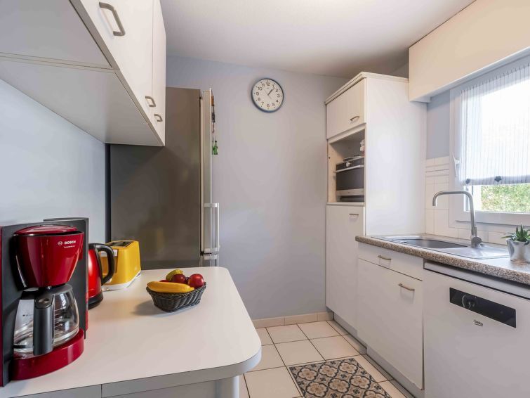 3-Zimmer-Wohnung 70 m2 im 2. Stock. Wohn-/Esszimmer mit TV, Flachbildschirm und Klimaanlage. Ausgang zum Balkon, Richtung Süden. 1 Zimmer mit 1 franz. Bett (1 x 160 cm, Länge 200 cm), TV, Flachbildschirm und Klimaanlage. 1 Zimmer mit 2 Doppelbetten (2 x 90 cm, Länge 200 cm), Klimaanlage. Küche (4 Kochplatten, Backofen, Geschirrspüler, Toaster, Wasserkocher, Mikrowelle, Tiefkühler, elektrische Kaffeemaschine, Kapseln für die Kaffeemaschine (Nespresso) extra). Dusche, Bidet, sep. WC. E-Heizung. Terrasse 10 m2. Balkonmöbel. Sicht auf das Schwimmbad. Zur Verfügung: Bügeleisen. Internet (Wireless LAN, gratis). Garage Nr. 12/13, Höhe 205 cm, Breite 220 cm. Bitte beachten: Nichtraucher-Unterkunft. TV nur FR. Rauchmelder. Inserat einer Privatperson nach Artikel 155, IV, CGI. XX
