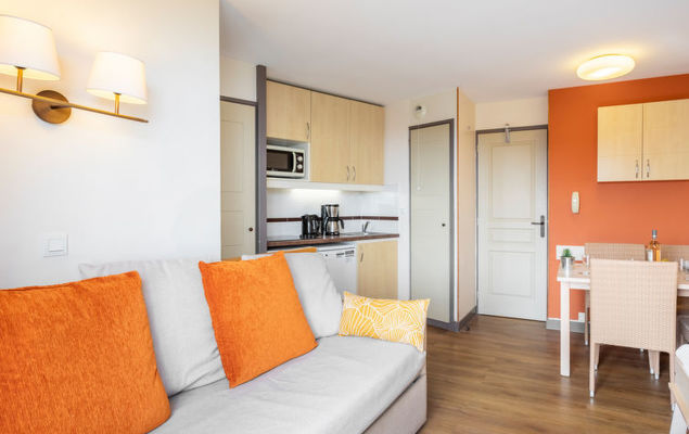 "Le Belvédère (D4 334)", 2-Zimmer-Wohnung 28 m2 im 2. Stock. Wohn-/Schlafzimmer mit 1 Ausziehbett (2 x 80 cm, Länge 190 cm), TV (Flachbildschirm). Ausgang zur Terrasse. 1 Zimmer mit 1 franz. Bett (140 cm, Länge 190 cm), TV (Flachbildschirm). Ausgang zur Terrasse. Kochnische (4 Kochplatten, Geschirrspüler, Toaster, Wasserkocher, Mikrowelle, elektrische Kaffeemaschine). Bad, sep. WC. E-Heizung. Terrasse 10 m2. Terrassenmöbel. Sicht auf das Meer. Zur Verfügung: Internet (Wireless LAN, extra). Parkplatz (überdacht). Bitte beachten: Nichtraucher-Unterkunft. Rauchmelder.