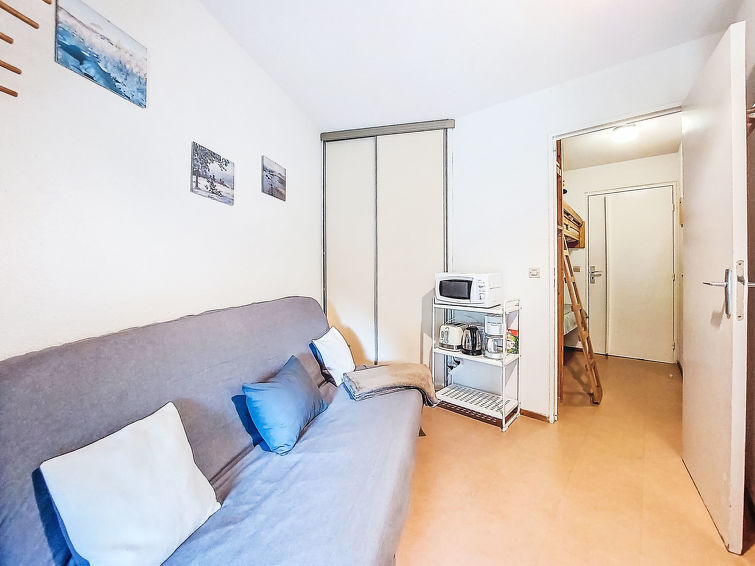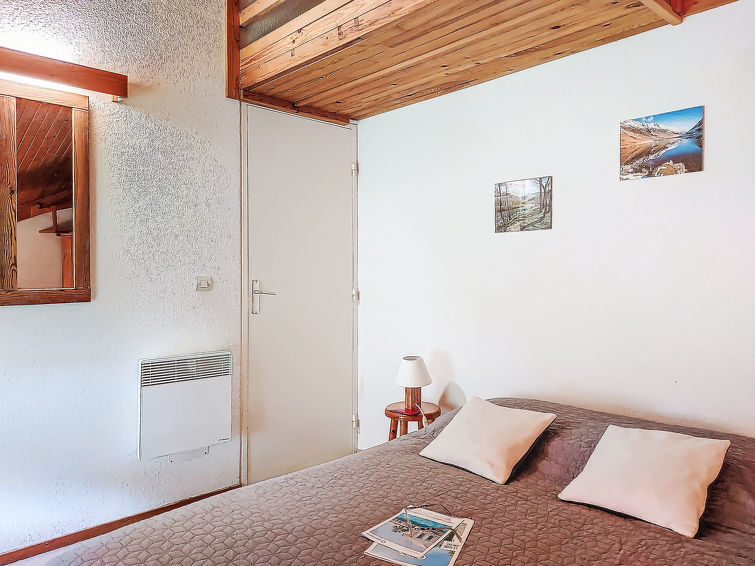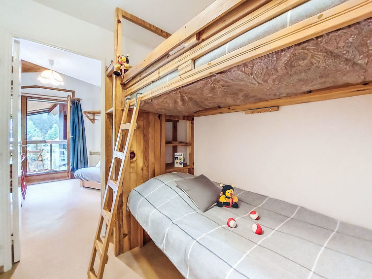 2-Zimmer-Wohnung 32 m2 im 4. Stock. Wohn-/Esszimmer mit 1 Doppeldiwanbett und TV. Ausgang zum Balkon. 1 Zimmer mit 1 franz. Bett. Eingang mit 1 x 2 Etagenbetten. Kochnische (2 Kochplatten, Backofen, Toaster, Wasserkocher, elektrische Kaffeemaschine, Kombinationsmikrowelle). Bad, sep. WC. E-Heizung. Balkon 3 m2, Südwestlage. Balkonmöbel. Sicht auf die Berge. Zur Verfügung: Babybett. Internet (WLAN, extra). Bitte beachten: TV nur FR. Rauchmelder. Gebäude F. Gerüste werden an der Fassade des Gebäudes im August 2023 vorhanden sein. 74085 000459 OM